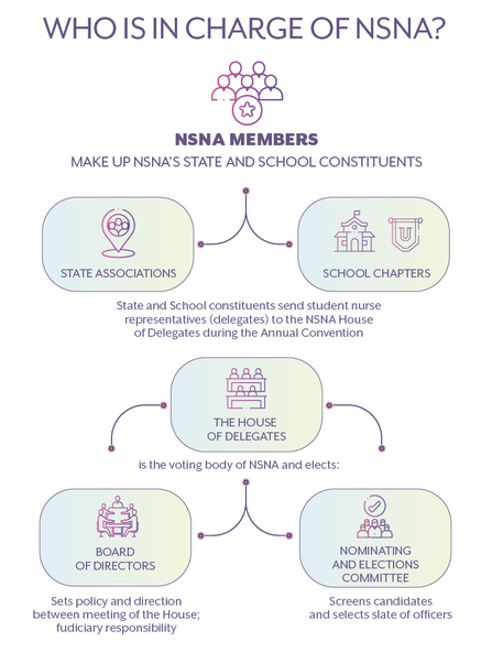 NSNA's Board of Directors is made up of 9 nursing students who are elected at the organization's Annual Convention and one ex-officio Board member elected by the Council of State Presidents. Two non-voting consultants are appointed by the American Nurses Association and the National League for Nurses to provide guidance. NSNA also employs a full-time staff headquartered in Brooklyn, NY.